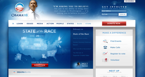 Regardless of your political leaning, you have got to admit that the Obama campaign has some style. Obama’s website was even featured on WebCreme (a top favorite blog for Web Design inspiration.)