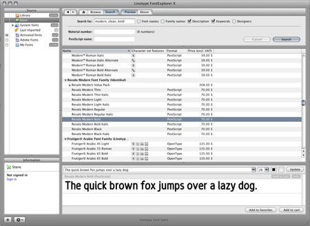 FontExplorer is set up as the iTunes on Font Management. You can keep your Fonts organized and purchase new ones to add to your Library. Linotypes Font Catalog is accessible right from your FontExlorer software.