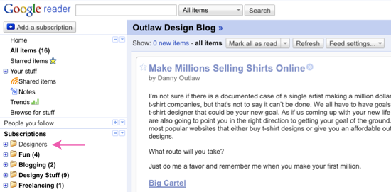 Because I wanted to focus on joining in more on the discussions from other designers sites, I made a folder specifically for blogs written by designers. The items in my “Designers” folder focuses more on smaller sites maintained by one or two designers, whereas larger sites like Smashing Magazine or NetTuts fall into my “Designy Stuff” folder.